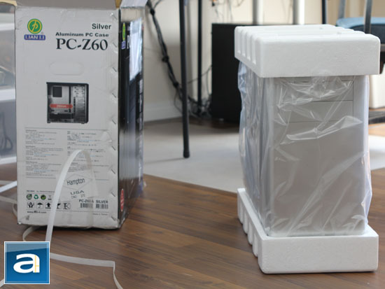 Clipped between two large Styrofoam brackets at the top and bottom is the Lian Li PC-Z60 aluminum computer case. The accessories are placed inside the case, just like every single one I have reviewed in the past. As I have alluded to in the previous paragraph, the particular unit we have received for review is the silver version; the chassis is also available in black. I am slightly biased towards the more conservative black design, but I promise you I will keep my evaluation objective throughout this review. With that in mind, we can see the PC-Z60 wrapped inside a large plastic bag to prevent any scratches from occurring during transport, as shown in our photo above.