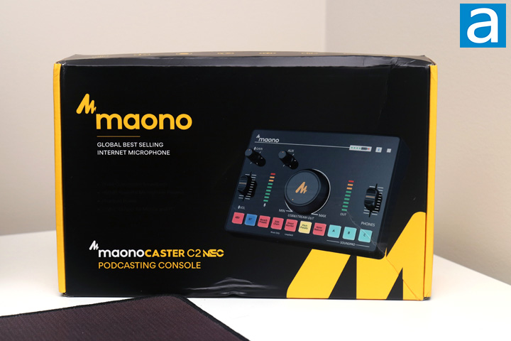 Out of the shipping packaging, you can get a better look at the Maonocaster C2 Neo. You can see the box did encounter damage from the shipping process, as there are notable dents on the front and bottom. In fact, the front is pushed in so much that the top area is protruding upwards. Otherwise, we have a pretty typical black box with yellow accents. This is pretty similar in style to the Maono GamerWave's retail container. A large company logo can be found on the left side, followed by the product name underneath. Maono describes this as a "Podcasting Console", as it has more functions than a typical audio interface, but we will look through these features later on in our review. There is also a scaled down image of the unit itself on the right side. Around the box, we have more features and specifications to speak about. Just for some clarification, if you look at Maono's website for this unit, you will see that this is also called the AMC2 Neo, but for consistency in the review, we will call it by its box name.