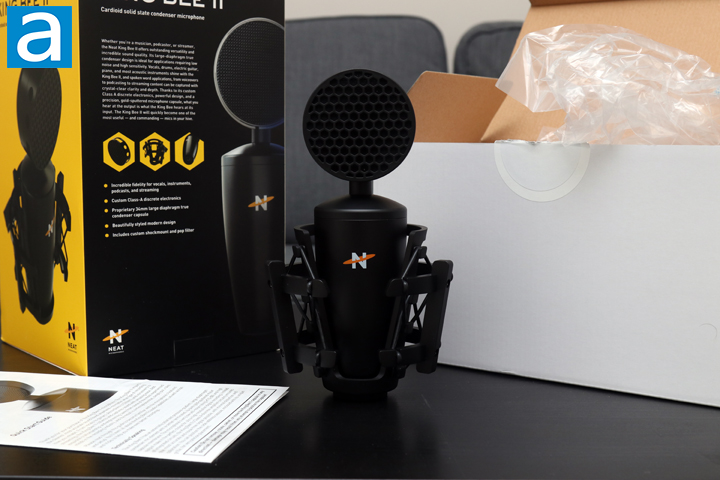 The Neat King Bee II is packaged between two large Styrofoam brackets. Some documentation is included with the microphone, which goes over setup and usage information. The King Bee II comes mounted in the Beekeeper shock mount and with the Honeycomb pop filter on the head. Otherwise, there is not much else to this packaging, so let us take a closer look at the microphone itself.