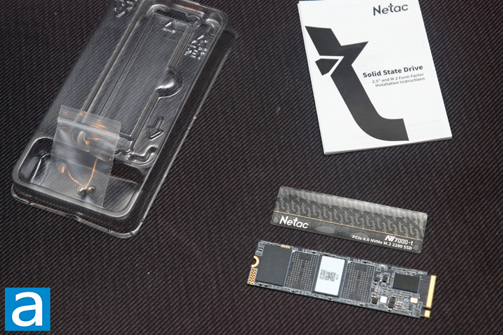 The Netac NV7000-t is packaged well inside the retail container, with the NVMe SSD sandwiched between two plastic trays. Along with the drive, we also have a thin metal heatsink which adheres to the drive as well as a resealable bag with two screws to mount the drive. We also have a user manual for the SSD, although it is a generic one for both M.2 and 2.5" form factors, so do be sure to follow the correct instructions.