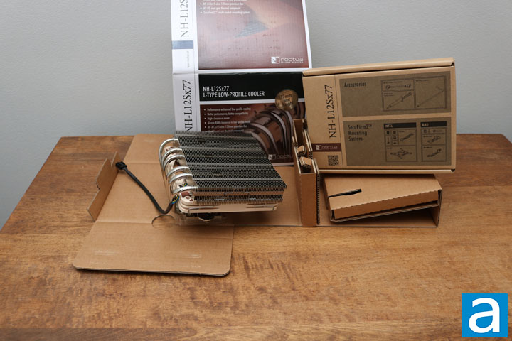 Unboxing the Noctua NH-L12Sx77 is a pleasant experience. The box easily opens along the top, and all the accessories are neatly packed into a rectangular box. Below the accessories, we find another box which contains the cooler and the fan. All of this means the contents will stay safe if there is damage to the exterior. All the installation components are also listed on the front of the accessory box, making it easy to know if anything is missing from the contents. As you can tell from the specifications, there are accessories to support installation on all of the latest AMD and Intel sockets.