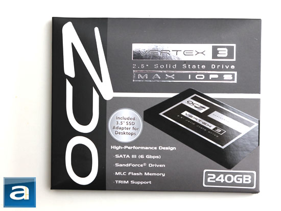 Hollowing up the packing material from inside the shipping package is the retail box of OCZ's Vertex 3 Max IOPS 240GB SSD. It comes in a compact and lightweight box, with a design appropriately derived from its predecessor, the OCZ Vertex 2. The company incorporates a sleek and attractive design composed mainly of a black, gray, and white color scheme with elements of shiny silver where it says "Vertex 3 Max IOPS" across the front. Asymmetrically tiled into three sections, OCZ's logo is very prominently featured on the left hand side, while a photo of the SSD itself at 3/4 angle can be noticed on the bottom tile. A short list of feature highlights is printed under the "Included: 3.5" SSD Adapter for Desktops" notification, as shown in our photo above.