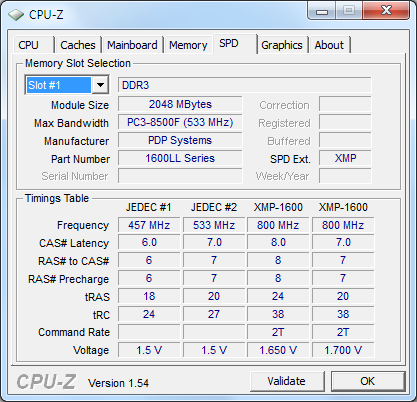 A screenshot of the memory tab in CPU-Z with the Patriot's Viper II Sector 5 PC3-12800 2x2GB installed. The SPD timings table in CPU-Z reads standard JEDEC specifications programmed into the memory, as well as Intel XMP data for running the memory at DDR3-1600. Using the latest BIOS revision, our Asus P7P55D-E Premium motherboard used for testing had no issues detecting and working with the Patriot RAM and its XMP settings. As you can see in our screenshot provided above, this Patriot dual channel kit runs at a relatively high frequency of 1600MHz (800MHz actual clock) in conjunction with 8-8-8-24 latencies at 2T command rate. On the other hand, it promises 7-7-7-20 at 1.70V -- a voltage generally not recommended for Nehalem processors, but we will see how well the latency scales in our overclocking tests later on in this review.