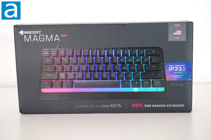Peeling the shipping package off, we can see the retail packaging of the ROCCAT Magma Mini. The background color is in accordance with the ROCCAT's theme color. In the middle of the cover lies the top view of the keyboard with all RGB LEDs lit up. From the picture, we can see the RGB lighting on the keyboard is pretty fancy. The company logo and the model name are at the top left of the box, while a "60% RGB gaming keyboard" description sits on the bottom right corner. The other key feature of the product, IP33 water and dust resistance, is proudly printed on the right side of the box. There is also a US flag printed on the box indicating the layout of the keyboard, not the origin of this product. The overall design of the package is simple, compact, and precise.