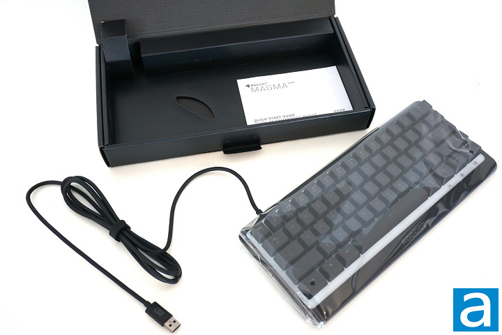Flipping the cover of the retail package over, we can see everything inside of the box, which includes the keyboard and a quick start guide. There is not a lot of stuff in there, which really makes unpacking easy. Unsurprisingly, a driver disc is not provided, since everything in this keyboard is plug-and-play. For more customizations such as key assignment and RGB lighting configuration, they can be done by using the ROCCAT Swarm software that can be downloaded from the ROCCAT website.