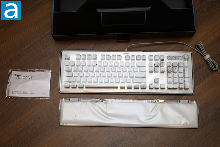 Out of the box, you will receive everything you need and not much else. Securely placed inside the box is the ROCCAT Vulcan II keyboard itself wrapped in a clear plastic bag, while its detachable wrist rest is placed inside a separate plastic bag. The only product literature included is a quick start guide, of course, also placed in a sealed plastic bag.