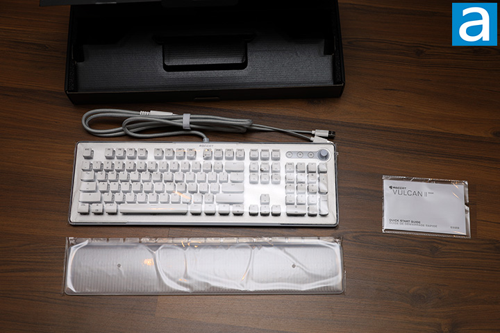 Out of the box, you will receive everything you need and not much else. Securely placed inside the box is the ROCCAT Vulcan II Max keyboard itself wrapped in a clear plastic bag, while its detachable wrist rest is placed inside a separate plastic bag. The only product literature included is a quick start guide, of course, also placed in a sealed plastic bag.