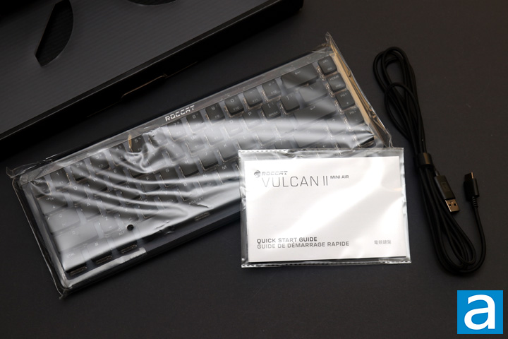 Out of the box, the ROCCAT Vulcan II Mini Air is packed in a transparent plastic bag to prevent scratches in transport, while its edges are lined with clear tape to prevent further surface scratches. A matching black USB Type-C to full-sized USB braided cable measuring 1.8m long is tied up with a Velcro strap. A quick start guide is found at the bottom to help users plug in their keyboard and find the different shortcuts available with the Vulcan II Mini Air. Otherwise, there is not much else to look at, so let us dig deeper into the ROCCAT Vulcan II Mini Air.