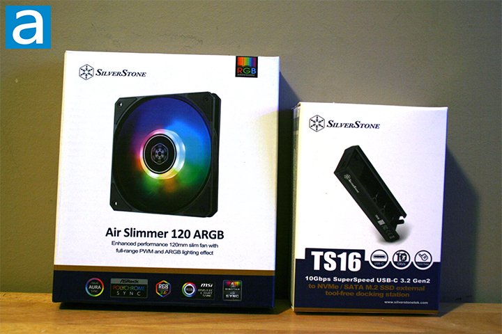 Our review unit of the SilverStone Air Slimmer 120 ARGB arrived via FedEx Ground from their offices in Chino, California, USA. The shipping package arrived here in Calgary, Alberta, Canada. Other than a few minor dents, the medium-sized brown corrugated cardboard box was in good condition. SilverStone also sent us their TS16 docking station, which will also be reviewed by Yours Truly.