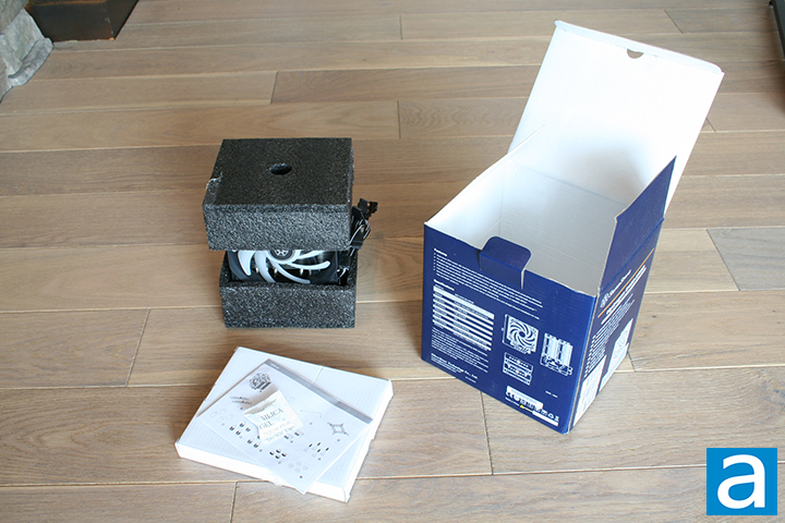 SilverStone does not usually follow much of a trend for how they design their power supply retail containers. The Hydrogon D120 ARGB comes in a blue and white box that resembles more recent SilverStone products in the last year. On the front, you will see a scaled-down image of the cooler front and center. The name and product description of "high performance CPU cooler" can be seen below the image of the cooler. The SilverStone logo and text are shown on the top left of the box with text indicating RGB on the right. The compatible motherboard lighting software is shown at the very bottom. Other details and specifications can be found around the box.
