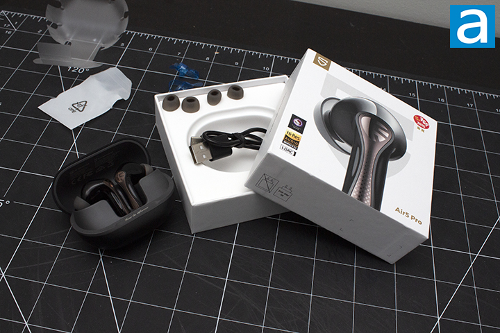 The box can be revealed by sliding off the top lid. Here, we will be greeted by the charging case and earbuds underneath, and above in the top lid, the user manual in another box. The earbuds are placed inside of the charging case, as with many other true wireless earbuds. Additionally, there are another two boxes underneath the case mold containing the charging cable and additional earphone tips. The tips come in two additional sets of sizes, so you will be able to find a proper fit for yourself.