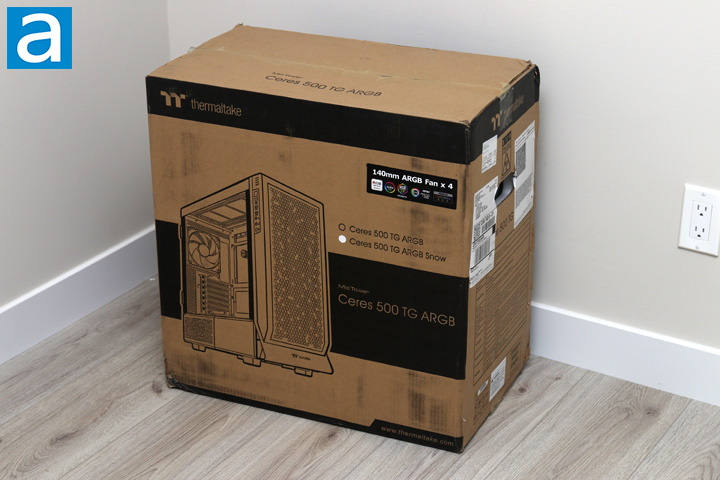 Today's review unit of the Thermaltake Ceres 500 TG ARGB Snow arrived from Thermaltake's offices in City of Industry, California, USA. Traveling with UPS and their Standard ground service, this box arrived in good condition. There is one area on the corner edge with a notable impact, but most cases have thick foam in these areas to prevent damage from spreading to the item inside. Similar to the last Thermaltake chassis, the Core P3 TG Pro Snow, this cardboard box doubled as the shipping container. This brown corrugated cardboard box shows off the Ceres 500 TG ARGB in black outline on the front panel. The product name can be found beside the image. The company logo and name can be seen on the top corner. Finally, you can see a colored label at the top to show there are four addressable RGB fans included in the Ceres 500 TG ARGB Snow, and these fans are compatible with all of the major motherboard manufacturer software, including Asus, Gigabyte, MSI, and ASRock. Otherwise, around the box shows more specifications about the enclosure inside.