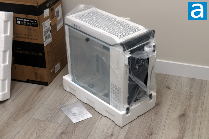 Unlike the aforementioned Core P3 TG Pro Snow, the Thermaltake Ceres 500 TG ARGB Snow comes fully assembled. It is sandwiched between two Styrofoam brackets to ensure the case is kept safe in transit. A clear plastic bag also surrounds the product to prevent any surface scratches. A small manual can be found in a separate plastic bag to help with system assembly and installation. Otherwise, there is not much else to look at here, so let us take a closer look at the Ceres 500 TG ARGB Snow itself.