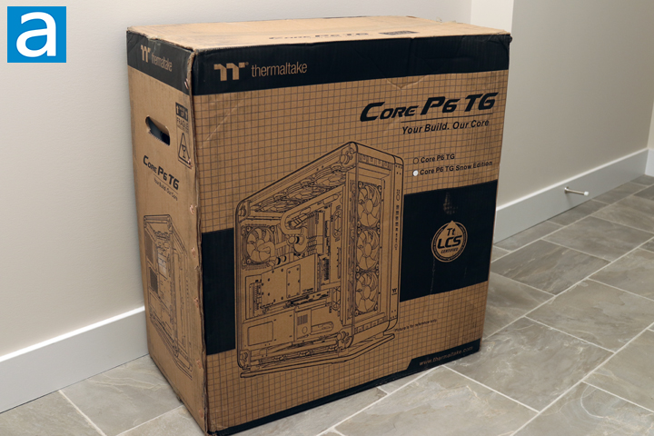 Today's review unit of the Core P6 TG Snow arrived from Thermaltake's offices in City of Industry, California. Traveling with UPS and their Standard ground service, this box arrived in a bit of a strange condition. Its exterior was generally clean, although there are a few scuff marks and bumps around the sides and corners. However, the most interesting thing is that the box was opened at the top. Nothing was missing and the inner contents arrived in a good condition, but it was a bit strange to receive an open container. The shipping container also doubles as the retail container, which is a standard brown corrugated cardboard box. Around the box is Thermaltake's logo at the top and the product name on the right side. Down the side, you can see the Core P6 TG is available in a standard black and the Snow edition we have today. In the middle we have an outline of the case inside, with a few pipes to possibly indicate its potential use for custom water loop builds. Around the edge, we have a few specifications and features for your information.