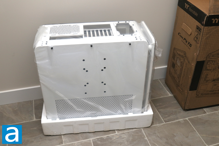 The Thermaltake Core P6 TG Snow was packaged in a decently thick plastic bag and sat between two thick white foam brackets. This foam did take the brunt of the damage during shipping, as some parts of the foam were a bit broken, but everything was still holding together. As this is a tempered glass case, there are plastic wraps found on both sides of each glass panel for extra protection. One thing I noted immediately as I took this case out of the box was how heavy it was, although we will explore the reasons for this as we move on in our inspections.