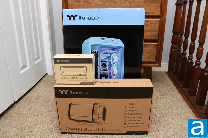 As usual with cases, the Thermaltake The Tower 300's shipping box is its retail box as well. The outside was in fairly good condition after arriving here in Calgary, Alberta from City of Industry, California via UPS Standard. There were no obvious dents or breaches here, which is a good sign. Otherwise, The Tower 300 has a box in full color, which is not usually the situation. On the front, we find an example image of what a computer may look like built in the case. The rest of the retail container continues with images of the case and the specifications of The Tower 300. Thermaltake also sent us two accessories that can be bought separately. One is a small LCD screen, which can be installed in The Tower 300 and programmed to feature different pieces of information; more on this later. The other is a stand kit to rest The Tower 300 on its side.