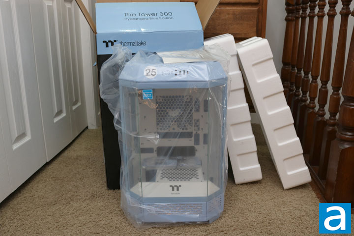 After opening up the retail box of the Thermaltake The Tower 300, the case is held in place by two large Styrofoam blocks. These keep the case stable through transportation and saves the case from large bumps or bruises. A plastic bag covers the case to prevent scratches. A manual is included, and the rest of the included accessories are found in a box inside the case.
