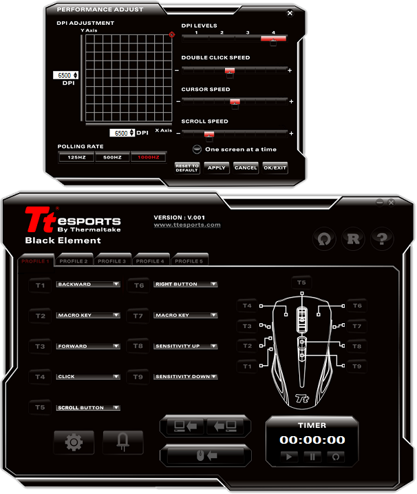 Thermaltake recommends the user to install the software before plugging the Tt eSPORTS Black Element in. The driver software installation took next to no time to complete, as it only requires the user to simply read and click 'Next' repeatedly. If you don't like reading, feel free to pull out an old mouse lying in the corner and madly click away. The provided software is quite plain in looks, but in a sense it incorporates a certain degree of slickness and style, which consists of a mainly black background fused with streaks of white along with text of the same color. The software provided in conjunction with the mouse's 128KB onboard memory allows up to five different profiles for custom button assignments, click speeds, polling rates, scroll speeds, dpi adjustments for both the x-axis and y-axis separately, and five different colors as lighting options for the logo and scroll wheel to be stored on the Black Element itself. The software also provides you with a means to reset everything to the default settings, as well as giving you an option to register your profiles online. Generally speaking, many of these features found in Thermaltake's provided software is quite standard, as what you would expect from a gaming mouse. Features such as independent X/Y axis sensitivity adjustment are one of the most advantageous features of the mouse, as gamers such as my colleagues Kenneth, Jeremy, and I would grow to appreciate -- this feature could very well enhance game play in various games. As mentioned earlier, there is also a feature where you could register your profiles online. This gives gamers a variety of perspectives on how other users set their settings on their gaming mouse, giving you a better understanding of specific settings you should use for your own Tt eSPORTS Black Element. The software also incorporates a timer at the bottom right of the menu screen for keeping track of how many hours you have spent playing games. Unfortunately, you have to manually start and stop this timer yourself.