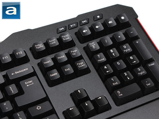 Corresponding to the ones on the left are four media control keys on the right for a nice overall symmetrical design. Specifically, we have Previous, Play/Pause, Skip, and Stop buttons for all your favorite c-rap music from 50 Cent, Lloyd Banks, and Tony Yayo. I am not going to go over their functions in detail, since it is rather self-explanatory. Right above the numeric keypad are four additional control keys with Cherry MX Black keyswitches. This includes a volume up, volume down, mute, and backlight brightness control. I am not exactly sure why the volume up is on the left and volume down is on the right, since it is usually the other way around -- unless you live in Australia, of course. The backlight brightness control allows you to increment the illumination intensity along three discrete levels; with the last option of putting the white LED into pulse mode.