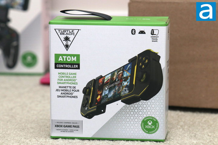 The Turtle Beach Atom Controller has a pretty familiar looking retail container as we have seen from other Turtle Beach products. This means we have a white and green color scheme. The front shows off the Turtle Beach logo with its product name underneath. A descriptor of "Mobile Game Controller for Android Smartphones" can also be found here. A scaled down image of the controller attached to a phone is shown on the right side of the front panel. For obvious reasons, a phone is not included with the Atom Controller. A few highlighted features on the front include Bluetooth connectivity, a compact travel shape, and a complementary 1 month of Xbox Game Pass Ultimate included in the box. Around the back, we have a few other features highlighted, including the fact it works with only Android 8.0 or greater devices with Bluetooth 4.2 support. There is not much else to take note of, so let us carry on.