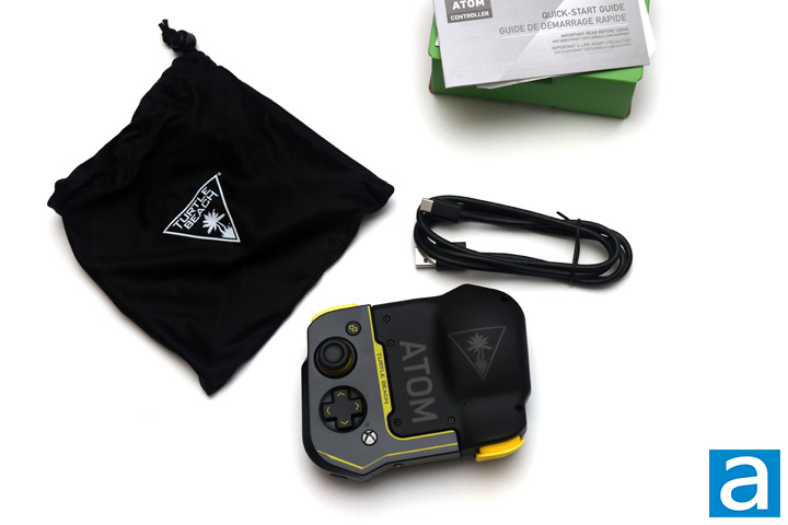 Out of the box, the Turtle Beach Atom Controller is contained in a nice black fabric carrying bag. A rubber USB Type-C to Type-A cable is also provided and it measures 1m in length. Finally, we have documentation for getting started with the Atom Controller and the aforementioned 1-month code for Xbox Game Pass Ultimate. There is not much else to look at, so let us take a closer look at the controller itself.
