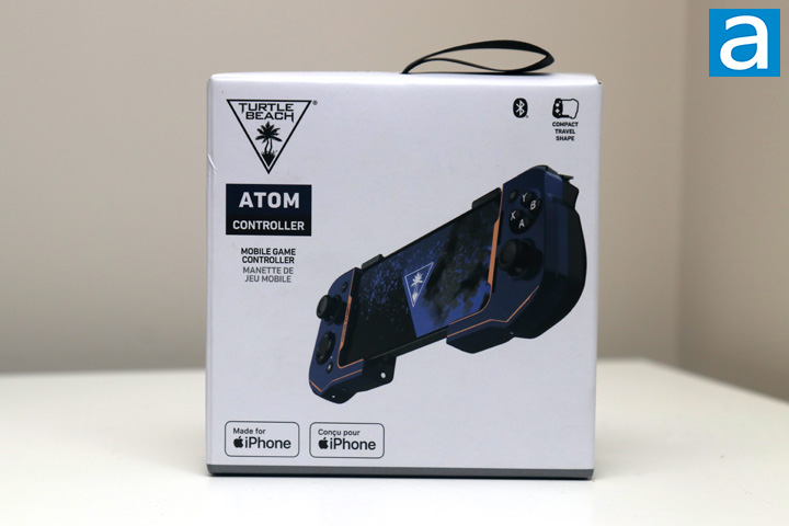 The Turtle Beach Atom Controller for iOS has a pretty familiar looking retail container as we have seen from other Turtle Beach products with some notable differences. However, gone is the green and here we have just a white box. This might be to align with the white boxes of Apple products. The front shows off the Turtle Beach logo with its product name underneath. A descriptor of "Mobile Game Controller" can also be found here. A scaled down image of the controller attached to a phone is shown on the right side of the front panel. For obvious reasons, a phone is not included with the Atom Controller. A few highlighted features on the front include Bluetooth connectivity and a compact travel shape. Around the back, we have a few other features highlighted, including the fact it made for iOS devices, specifically calling out the iPhone 11 to iPhone 14 lineup. It should work with any device running more recent versions of iOS, but Turtle Beach only specifies to have the latest iOS version installed. Apple states a wireless game controller should work with at least iOS 16.