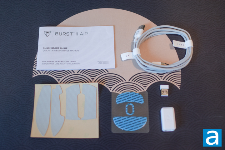 Inside the box, we find an effort to reduce plastic packaging. There is a piece of foam in the cover to hold the mouse in place on a molded cardboard tray. There is the welcome inclusion of grip tape, large-sized mouse feet, USB Type-A wireless transmitter, USB Type-A to Type-C transmitter adapter, and a flexible USB Type-A to Type-C charging cable. Although the mouse is usable out of the box with no additional software, Turtle Beach Swarm II can be downloaded to further customize and fully utilize the mouse features.