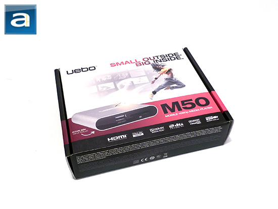 "SMALL OUTSIDE. BIG INSIDE." These are the words right off of the front of the product's retail box. At first glance, the UEBO M50's retail box has an excellent presentation and quickly highlights the key features of the product. Indicating that it is a "mobile 1080p media player", the M50 is targeted for people who need a media player for on-the-go usage. On the front, you can also see a photo of the product itself, along with an arrow saying this is its actual size. This is a bit misleading, as the actual product is a bit smaller than the image on the front of the box. In the background is an array of images and movie clip thumbnails being shown; this is to indicate the large number of possible media options available. In addition, there is a picture of an athletic girl leaping out of the media player. Not totally sure what the meaning of this 'flying' girl is, but all I can say is she isn't wearing a skirt. At the bottom of the box is a horizontal list of specifications that the product supports. From left to right, we have: HDMI, Full HD 1080p, Dolby Digital Plus, DTS 2.0 + Digital Out, Dolby TrueHD, and USB. That doesn't tell us too much about its capabilities, but it gives you a rough idea. Here is a list of the full technical specifications acquired from the manufacturer's website: