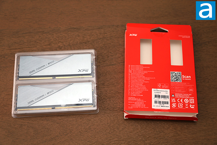 Our review unit of the XPG Lancer CUDIMM RGB DDR5-8400 2x24GB arrived in its retail hang packaging. If you look at the photo above, they do not advertise the ADATA brand on the XPG Lancer CUDIMM RGB DDR5-8400 2x24GB's retail packaging, instead using XPG only. This has been the case for all products within the XPG label for a while now. The XPG Lancer CUDIMM RGB's retail box is predominantly red with white text. XPG's logo along with the model name and product description is placed along the bottom, with a transparent sticker indicating its memory capacity and speed next to it. An array of icons highlights its clock driver, 80% recycled aluminum, and ECO branding is placed at the upper left and right corners. Across the middle is a picture of one memory module. More branding and product description in various languages can be found on the remaining sides of the box.