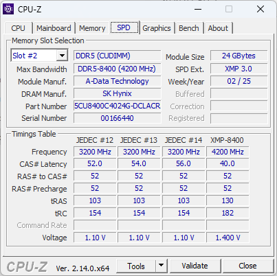 A screenshot of the memory tab in CPU-Z with XPG's Lancer CUDIMM RGB DDR5-8400 2x24GB installed. The SPD timings table in CPU-Z reads standard JEDEC specifications programmed into the memory as well as XMP data for running the memory at various speeds. Our ASUS ProArt Z890-Creator WiFi motherboard used for testing had no issues detecting and working with the Lancer CUDIMM RGB DDR5-8400 RAM right out of the box using the latest BIOS revision. The XPG Lancer CUDIMM RGB DDR5-8400 2x24GB retails for approximately $350 at press time.