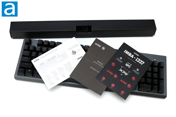 Out of the box, we have the XPG Mage wrapped in a bag and accompanied by three pieces of documentation. One is for quickly getting set up with the XPG Mage, while the other contains warranty information. The final sheet is actually a set of XPG-branded stickers, including one that reads "IMBA-1337". According to Urban Dictionary, "IMBA" is short for imbalanced, generally referring to when something in a game is too overpowering and requires adjustments to make it easier to play against. In the black box at the top, we have the 2m USB Type-C to Type-A cable to plug this keyboard into your computer. Otherwise, the XPG Mage is covered for two years of warranty, which is becoming standard for computer peripherals.