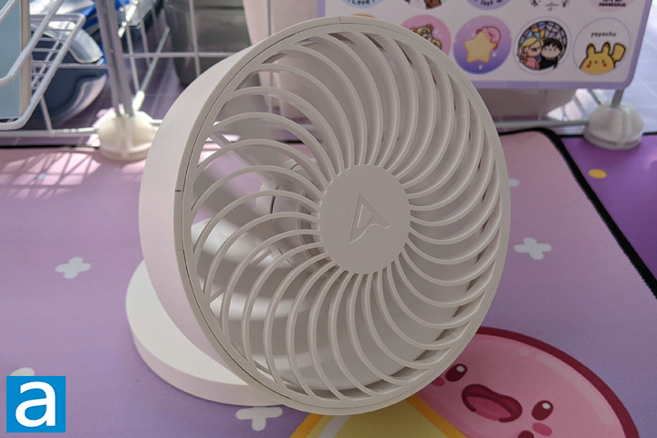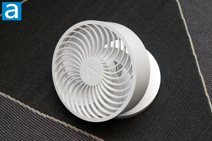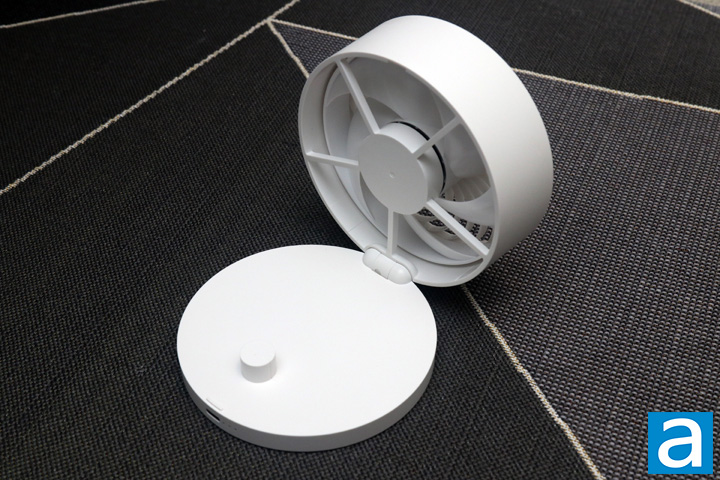 The fan portion pivots where it connects to the base, and it allows for users to aim the fan within a 90-degree range. The hinge moves smoothly but offers enough resistance, so it does not move about by accident. Moving to the base, we have a circular bottom with a dial at the back. This dial is used to control the speed of the fan. This dial does not have any steps and smoothly turns, changing the operating speeds from 600 to 3300 RPM.