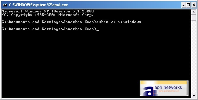 2. In the command prompt type subst x: c:\windows, where "x:" is what you want the drive letter to be, and "c:\windows" is where you want the assigned drive letter to point to. In this case it's pointed to c:\windows, you can set it to point to whatever folder you like.