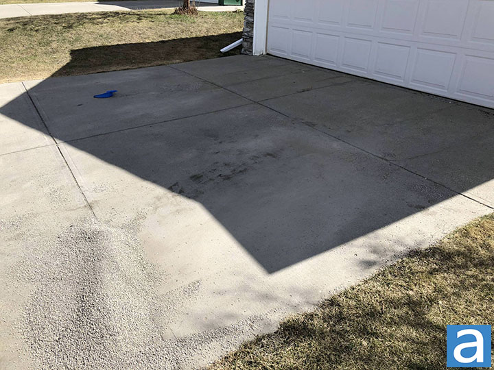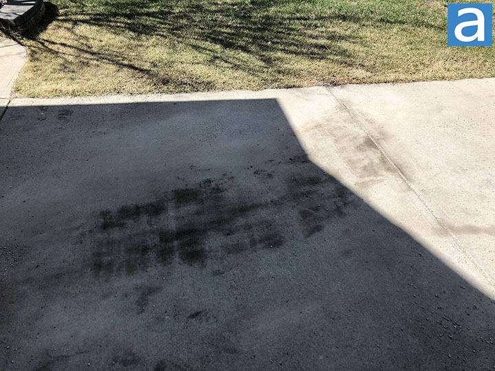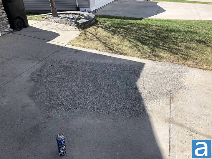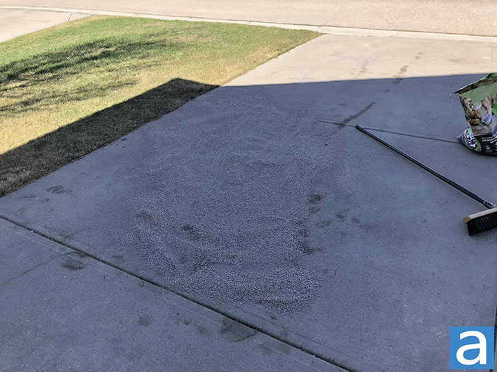 First, I used the push broom to clean the surface and remove any dirt or gravel. Next, I sprayed it liberally with the brake cleaner. Covering the above spill took one full can.