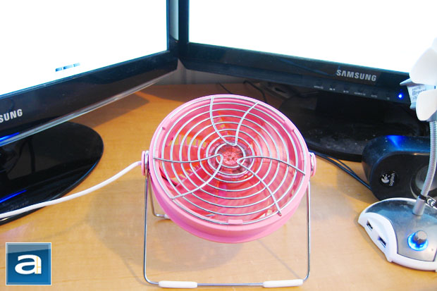 Looking at the flipside of the Air Penetrator USB, we can more clearly see the fan itself as well as the pink plastic covering on top. Our particular version is a very striking color, and does attract quite a bit of attention. Just imagine sticking this thing on your desk at work or bringing it to school one day. I'm sure this will help you get all the ladies, eh? With jokes aside, the fan blows air out on this side, while the intake is from the opposite with the metal grille. The internal fan is actually colored in a translucent pink as well, making it very hardcore pink. The USB cord is located on the left side from the circular plastic, and measures in at about 40" or 100 cm, which should be more than enough for most people. In terms of usage, since it is powered by USB, it is possible to take it on the go, utilizing products such as the Choiix Power Fort 5600 reviewed by my colleague Preston recently. With that in mind, it would be possible to pick up some girls where you never thought possible without a laptop before, and if that doesn't work, just think about all the attention you will receive just using this thing out in public. (Who knows, you can pick up some guys, too. - Editor)