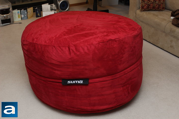Putting the sleeve over the black bag on the Sumo Gamer Suede is probably easier said than done, because there were some struggling moments. For one, because of the sheer size of the beanbag and the sheer lack of length in my arms, I had to work slowly to get the red sleeve wrapped around the beanbag. In addition, since the beanbag was still expanding after being vacuum packed, the black bag was still expanding in size. After two attempts, I finally wrapped it up, and the result is as you see above. At a huge size of 48" in diameter and 30" in height, this beanbag is not for a small apartment or condominium. In fact, even my parents slightly freaked out when they realized how large this blob was. Thus you probably want to have a large open area to put this thing.
