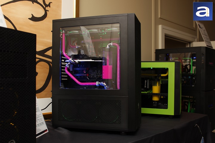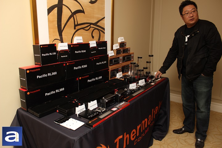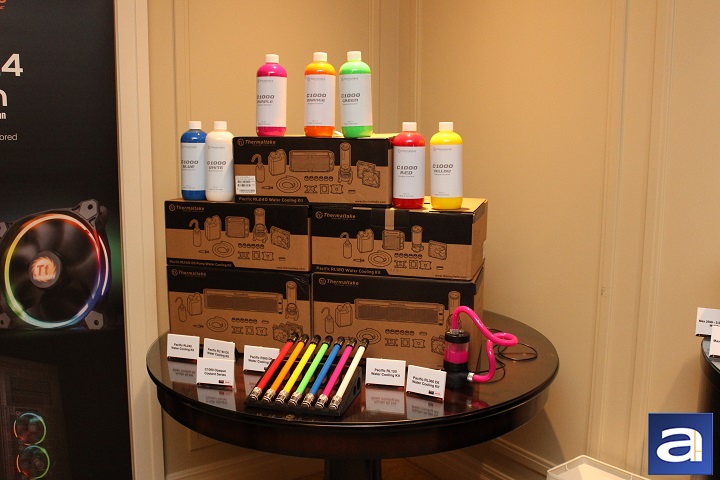 When I mentioned Thermaltake was hard at work, I was not kidding. Thermaltake is now tasked themselves with making water cooling products. I do not mean the closed loop water cooling products they have made before (Although they have come up with the WATER3.0). Thermaltake is now making hard tubes, fittings, water blocks, pumps, reservoirs, radiators, and all the other accessories that come with a full blown water cooling kit. As you may have noticed earlier, their systems that were on display were all liquid cooled. Each and every individual component, with the exception of the actual electronics of course, are Thermaltake products, including the liquid cooling products. From the photo above, you may have guessed Thermaltake has named this line the Pacific RL series, where each of the numbers represent the size of the radiators.