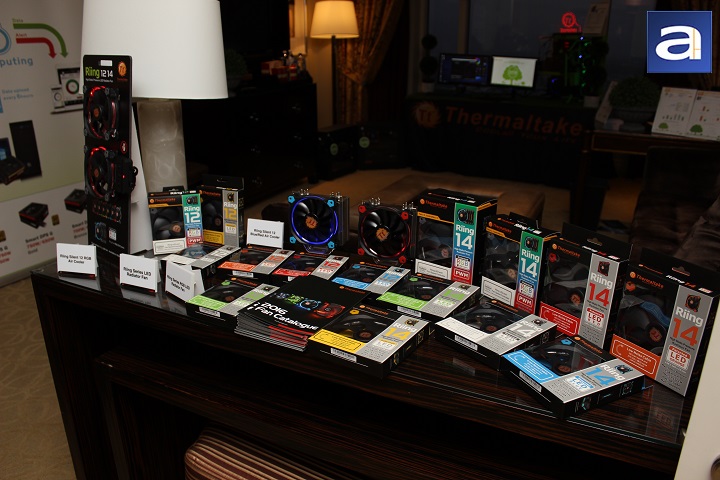 Of course, in addition to liquid cooling, Thermaltake is still quite active in producing air cooling products. The "Riing" design seen on the 120mm and 140mm fans is still patent pending, where a ring around the fan is lit up by LEDs. You are limited to only seven colors however. Though, Thermaltake did mention they will potentially be providing more colors in the future. The lighting effects can be easily controlled by a set of buttons.