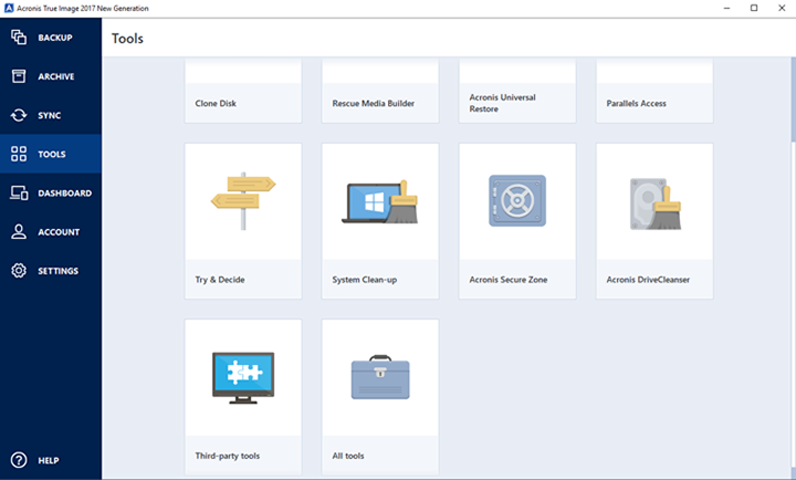 The tools tab houses all the other periphery functions of the software. Many of these are self-explanatory, but they are quite useful for the safety of your data. You can clone your hard drive, effectively making a system image. There is a "try and decide" function, which allows you to run unsafe operations without fully committing to them. System Clean-Up wipes the entire computer, while Drive Cleanser will only wipe the selected drives. Acronis Secure Zone is a useful tool, as it creates a safe partition on your hard drive for a backup. This feature can be important if you do not have any external drives or a NAS system to back up your system. Third party tools opens up your web browser where it will list some extra tools you might find useful. As you can see, there are quite a few more options here to make the experience easier and safer.