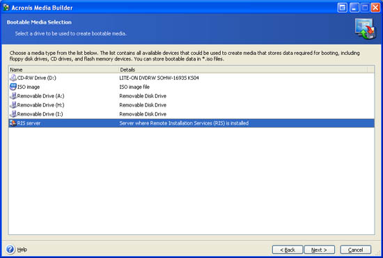 The last page before copying backup contents to your media of choice allows, well, the user to pick which device you would like to move it to. These devices include floppy disks (???), CDs, and USB mass storage devices. Most importantly though, is the inclusion of the RIS (Remote Installation Services), which allows users to upload the boot data files to any remote server with RIS installed.