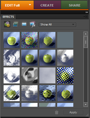 In Full Edit, the Effects, Layers and Adjustments sections are shown. Taking a closer look at Effects as shown in the screenshot above, we see that the standard filters included out of the box are available to create interesting and/or fun effects into our photos. There is an array of four effect buttons as seen above, under the sub-tab. From left to right, the different buttons are as follows: Filters, Layer Styles, Photo Effects, and All. This lists all the common filters and effects, ranging from a Bezel to more artistic effects such as Colored Pencil or Crystalize. Again, there isn't much new to this tab; however, I don't find a need need to make a major overhaul in this section anyway.