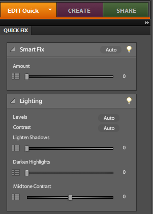 Following the Full Edit tab in the tab options drop-down menu is Quick Edit, which displays common photo adjustments by a series of sliders. The first of these adjustments is the Smart Fix option, which tries to find the best fitting fix for a certain photo. The image automatically updates on-the-fly based on the adjustment sliders located on the right side. Following up are lighting options, including Levels, Contrasts, Lighten, Darken, and Midtone Contrast. Similar to all the other sliders, changes are made in place, giving instant previews of each setting. All these settings are quite self explanatory. The automatic buttons for the Levels and Contrast settings actually work quite well from my experience, and make life much easier for those who only want to quickly optimize their photos.