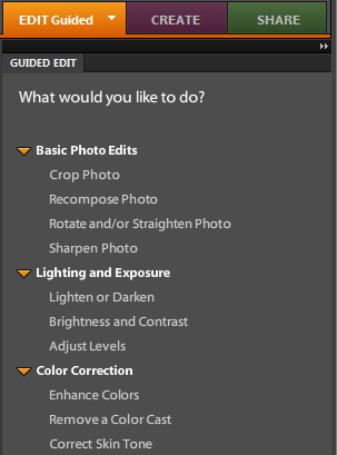 The final option in Adobe Photoshop Element 8's Edit drop-down menu is Guided Edit. It lists common activities that users would like to do on photos; from top to bottom those options are Basic Photo Edits, Lighting and Exposure, and Color Correction. One of the most important options in my opinion has to be the Correct Skin Tone adjustment. This feature guides users to fix some skin tone problems, as its name suggests, haha. Each of these options replaces the current Guided Edit tab area with either a slider or button, and gives an explanation of what to do with it to get the best results. The guided topics are fairly simple, but it can go a long way for individuals who are new to image editing.