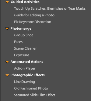 The final four options in Guided Edit are Guided Activities, PhotoMerge, Automated Actions, and Photographic Effects. PhotoMerge can merge multiple photos together to make one 'good' photo. We will take a deeper look into this feature on the next page. Guided Activities is quite useful for basic photo fixing, which is contrasted by Photographic Effects, which just puts some fun effects onto the photos.