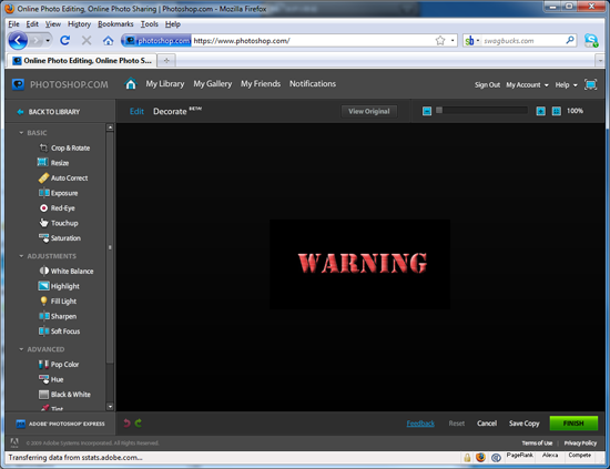 One of the key features on Photoshop.com is the ability to edit photos online. Although nowhere near as powerful as the Photoshop Elements 8 desktop application, it has a good collection of basic photos. This is convenient because you can now take a public computer to edit photos. Tools included in the Flash based interface from top to bottom: Crop & Rotate, Resize, Auto Correct, Exposure, Red-Eye, Touchup, Saturation, White Balance, Highlight, Fill Light, Sharpen, Soft Focus, Pop Color, Hue, Black & White, Tint, Sketch, and Distort. These tools should be good enough to run almost anywhere, and basic enough to touch up photos for Facebook or Myspace or for other purposes as well.