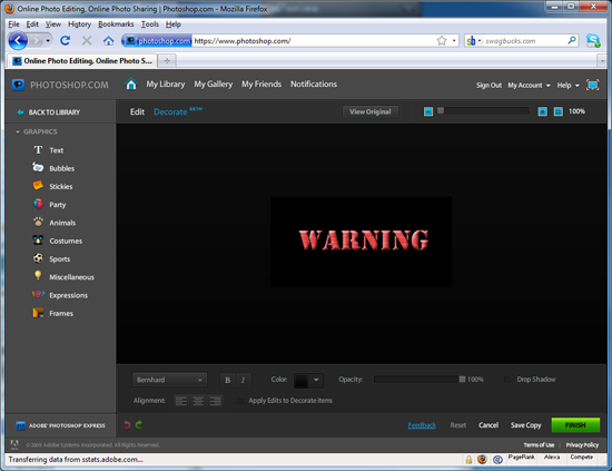 The second feature of the online Photoshop.com image editor is the Decorate function, which is still in beta at press time. From top to bottom, the tools are as follows: Text, Bubbles, Stickies, Party, Animals, Costumes, Sports, Miscellaneous, Expressions, and Frames. All of these are used to spice up a picture by adding available clips and/or text. Again, it is still in beta, so it definitely has a long way to go. We expect updates from it periodically with new content and more features, as the available content is still relatively sparse.