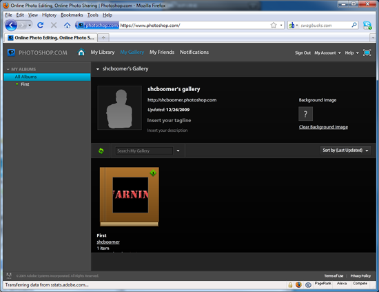 The final aspect of Photoshop.com is the online photo gallery. There are both private galleries for our personal collection, and public galleries for other users to look at, print, or share through a direct link, email, or a social networking website. The public galleries are posted under a subdomain of Photoshop.com. Our demo gallery can be found at http://shcboomer.photoshop.com.