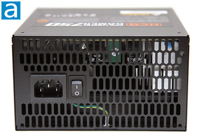 Starting from the back part of the power supply, we have the trapezoidal slit matrix mesh design as aforementioned; what you will find here is a horizontally aligned male connector for power input on the western edge along with an on/off switch. The low resistance mesh design is implemented to maximize airflow and minimize air resistance. This is done as heat needs to leave the power supply as easily and efficiently as possible, because the High Current Gamer Bronze 750W incorporates only one 135mm fan at the bottom with no auxiliary fan. It is also implemented in a relatively efficient manner, as the power input block takes up a minimal amount of room here. As with all active PFC power supplies, the Antec High Current Gamer Bronze 750W has an automatic full range (100V-240V) AC line voltage selection, so the user does not have to worry about manually selecting input voltage.