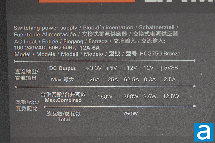 The voltage specification label on the top panel of the Antec High Current Gamer Bronze 750W. There are two main virtual rails. Up to 25A can be delivered via the +3.3V rail for a total of 82.5W; while the 25A on the +5V rail brings the output to 125W in this area. The total combined output for the +3.3V and +5V rail is 150W. In other words, your power allocation combination must fall within the limits of the listed specifications. Meanwhile, a single powerful +12V rail delivers up to 62.5A (750W) to reduce operating overhead compared to multiple +12V rails. Overall, the combined power output for the whole High Current Gamer Bronze 750W is... well, 750W haha. Again, your power distribution in your system must fall within the limits provided -- it must not exceed 82.5W on the +3.3V rail, 125W on the +5V rail and 150W combined for both, 750W on the +12V rail, and 750W combined between the +12V and +3.3/+5V rails. It does sound a bit confusing to understand how this works at first, but generally speaking, this configuration allows very flexible power demands and should be sufficient to accommodate most users. I have seen lower power outputs in the +3.3V and 5V rails for higher output rated units, and the overall distribution is very good for a 750W power supply.