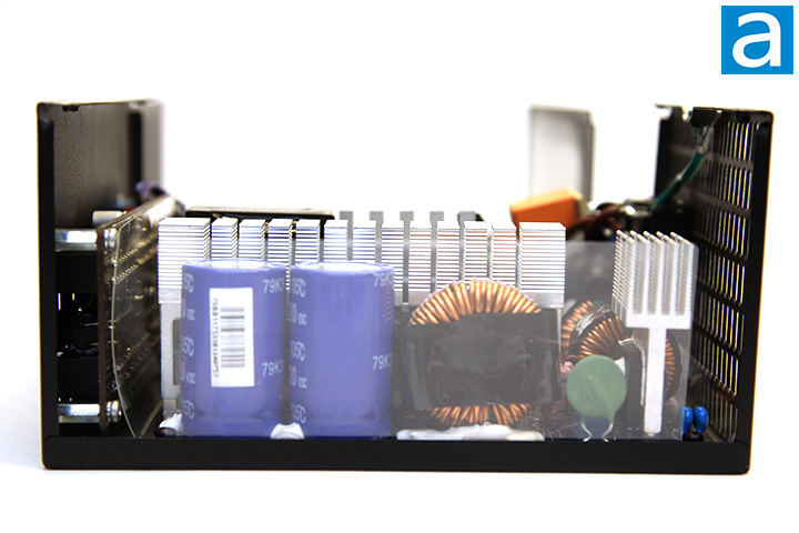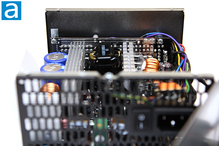 Disassembling the Antec High Current Gamer Bronze 750W is quite straightforward with the removal of four screws. I could not identify who the OEM of this power supply is. Our photo above shows an overhead view of its internal components. At first glance, the build quality appears to be excellent, as one would expect from the company. There are three main heatsinks inside. One small one and one large one is located on the primary side, while a second large heatsink resides on the secondary side, all of which are unpainted.
